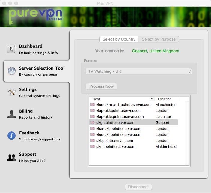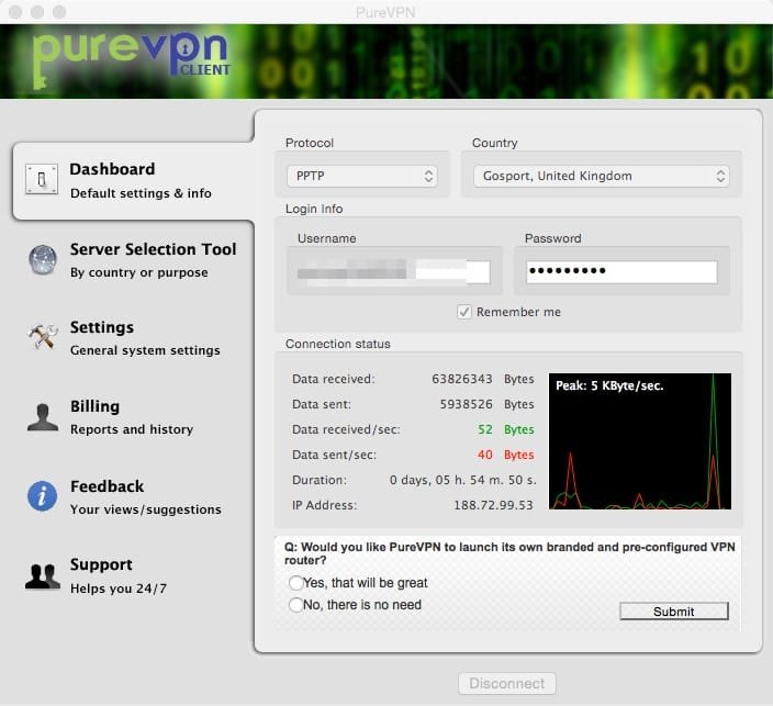 En el caso concreto de PUREVPN ellos tienen un cliente (ó programa) que te puedes bajar desde su sitio, una vez lo has contratado, y con tu usuario y contraseña te puedes conectar a muchos países (ver más abajo las fotos).